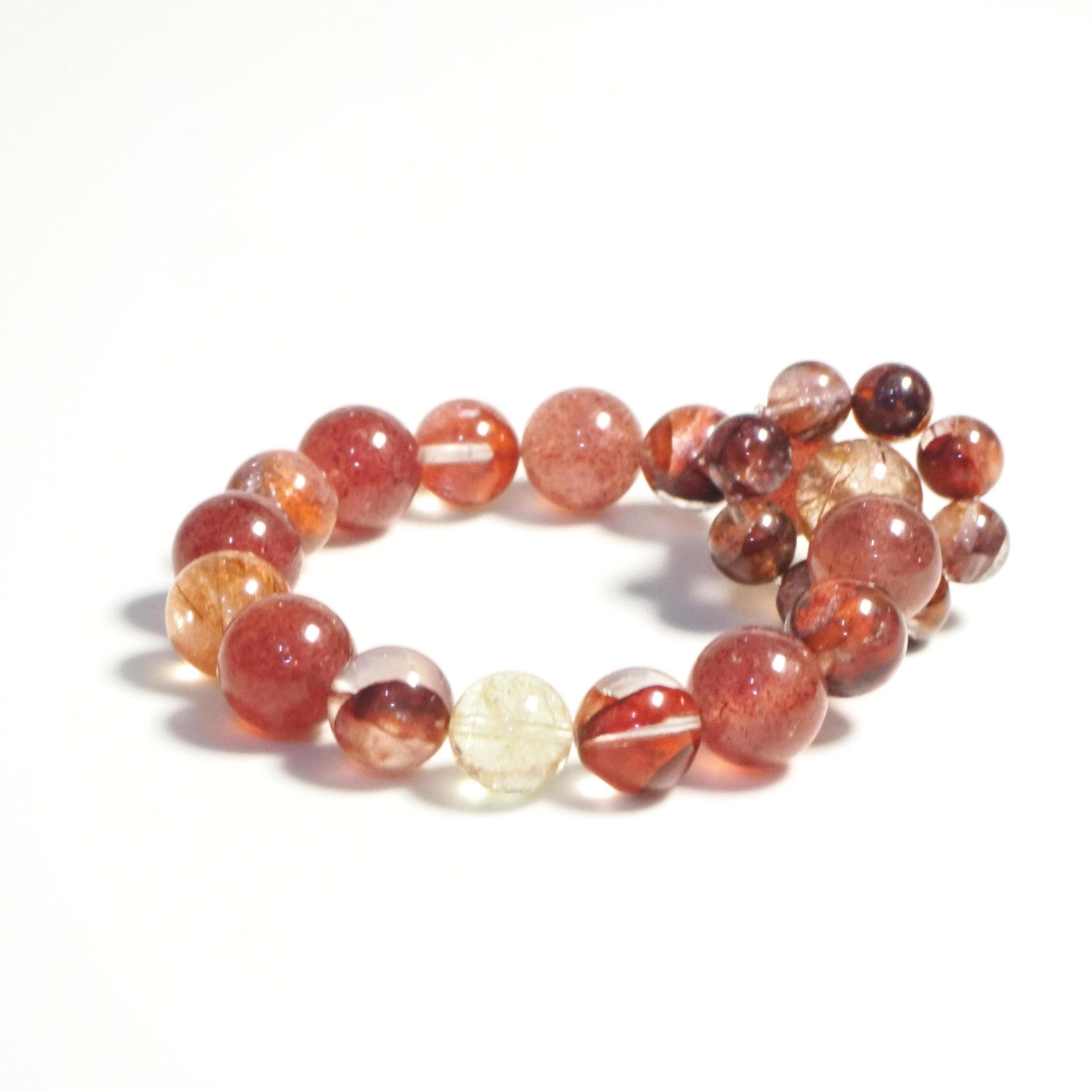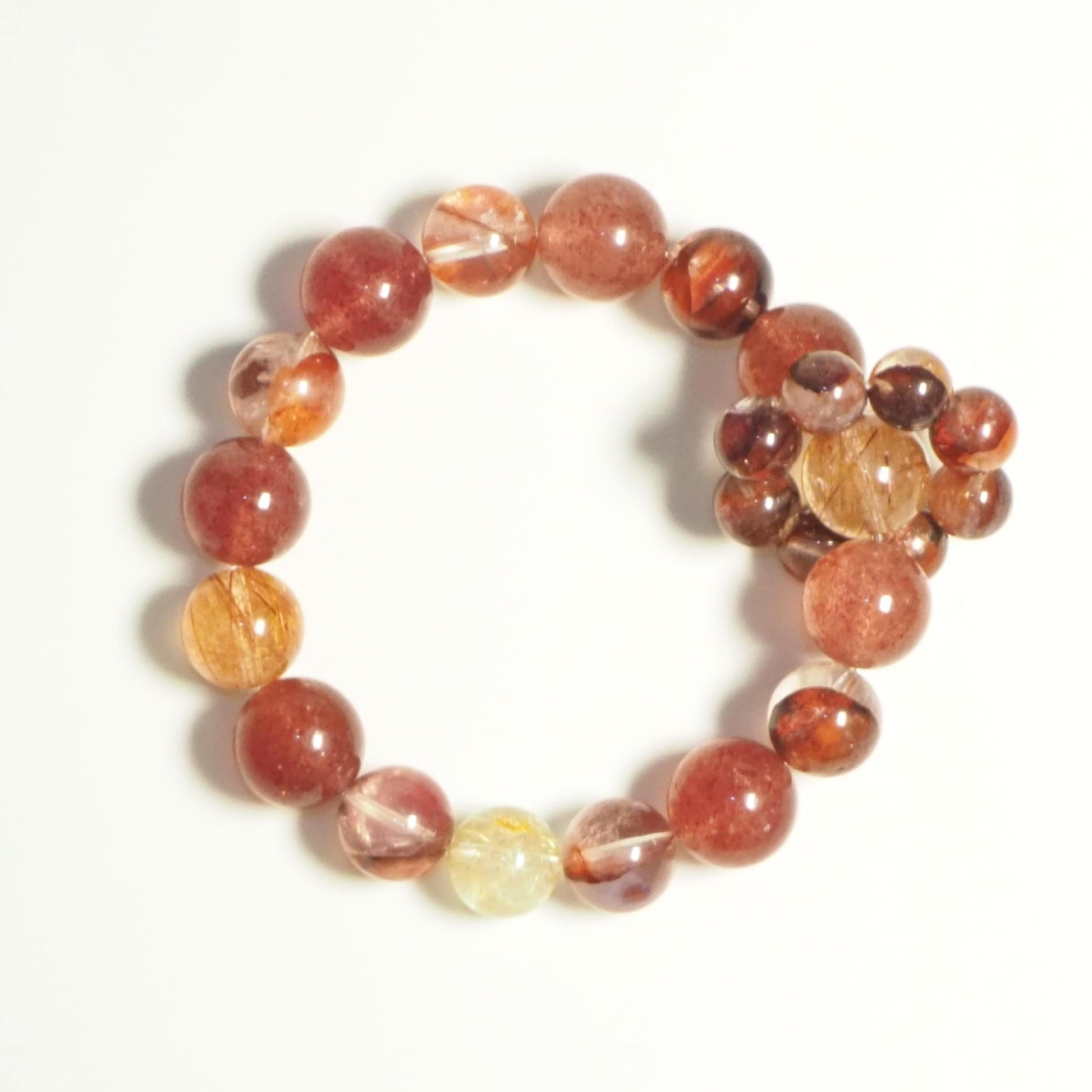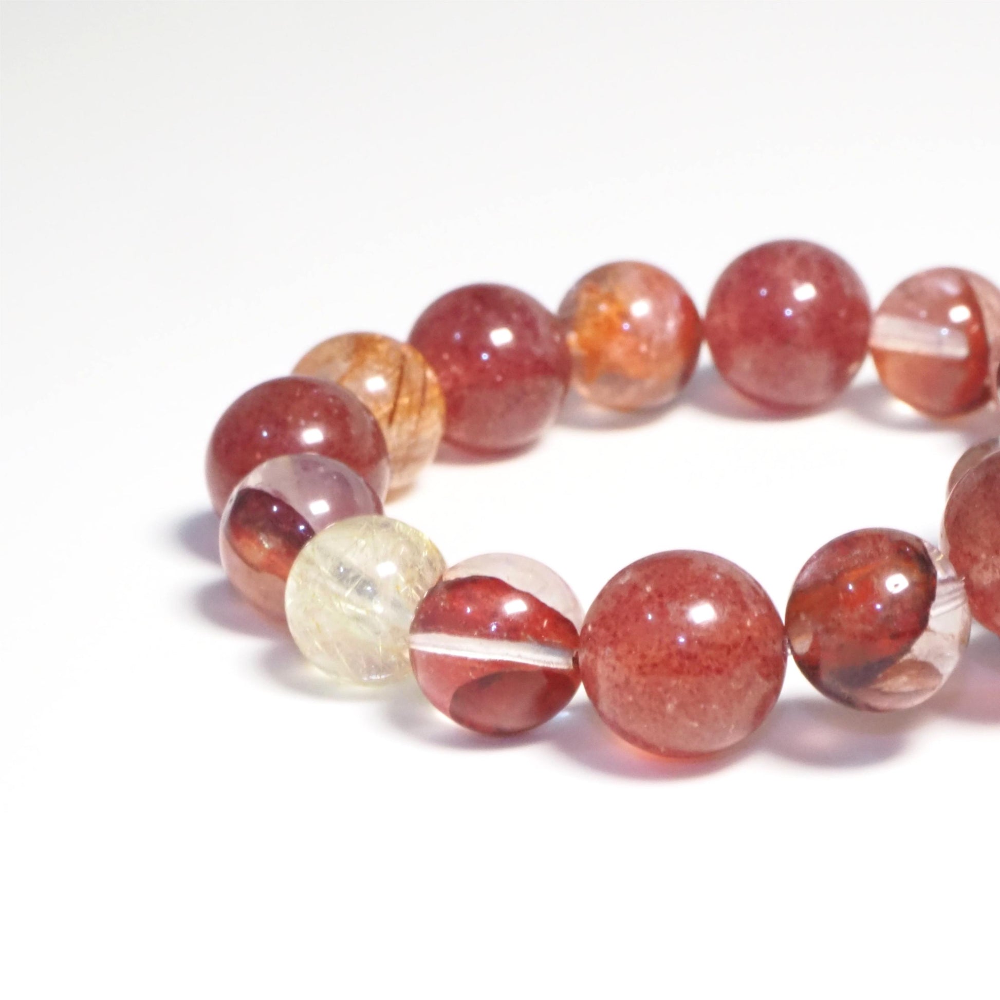 レッドヘマトイドクォーツは血行を促進し、活力を高め、健康とエネルギーをサポートします。ストロベリーアベンチュリンとルチルクォーツは、ペアリングすることで全体的なエネルギーをアップし、心身ともに活力を与えます。